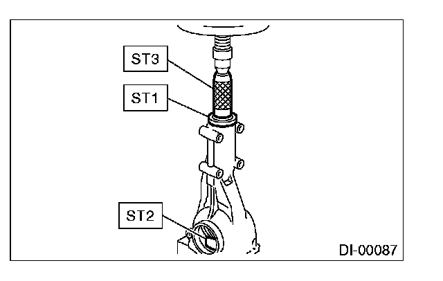 5) Press-fit the front bearing cone into case with ST1, ST2 and ST3.