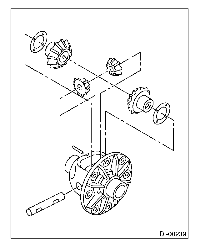12) Assembling differential case Install the side gears and pinion mate gears, with their thrust washers and pinion mate shaft, into the differential case.