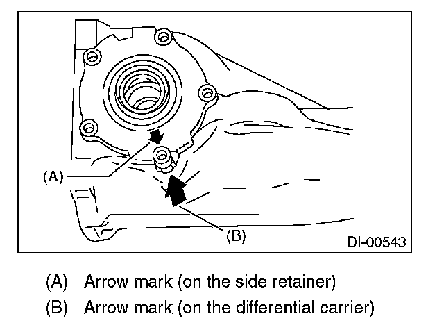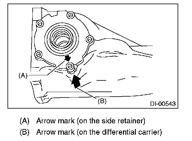 4) Align the arrow mark on the differential carrier with that on the side retainer during installation.