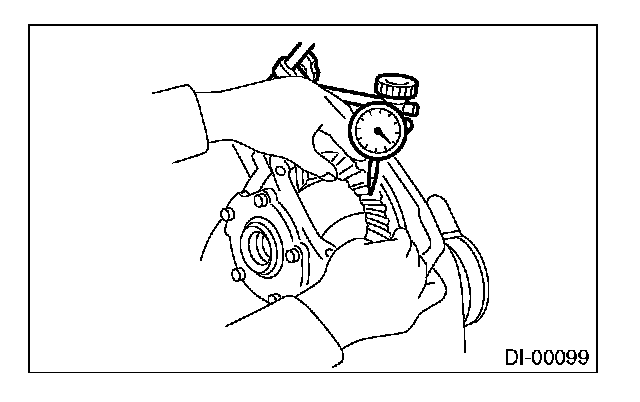 6) Measure the hypoid driven gear to drive pinion backlash. Set the magnet base on differential carrier. Align the contact point of dial gauge with tooth face of hypoid driven gear, and move hypoid driven gear while holding drive pinion still. Read the value indicated on dial gauge. If the backlash is outside the standard range, adjust the side retainer shim by the following method.