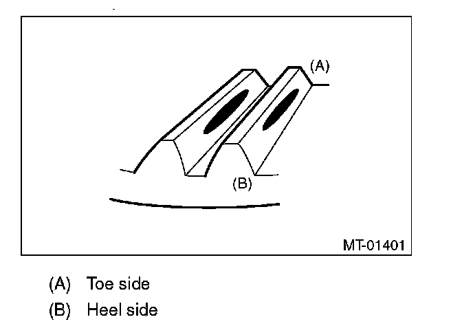 Check item: Tooth contact pattern is slightly shifted toward toe side under no-load rotation. (When driving, it moves towards the heel side.)