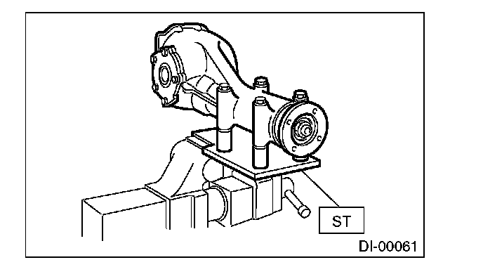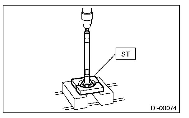 15) Remove the rear bearing cone from drive pinion by supporting the cone with ST.