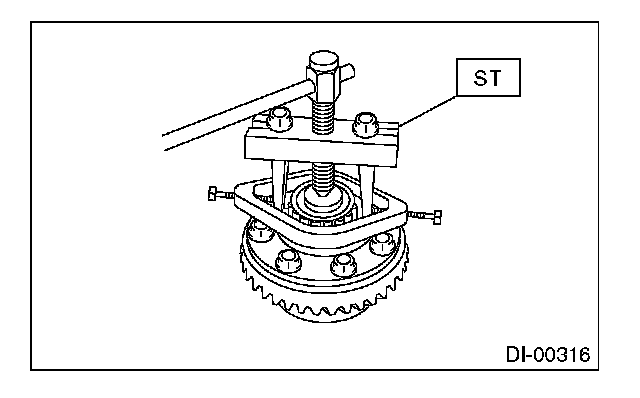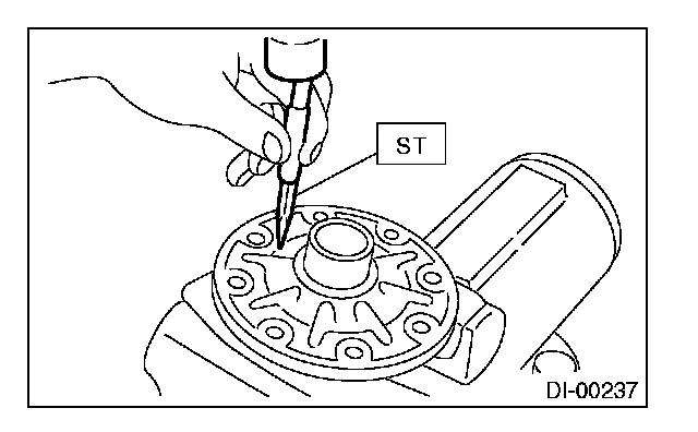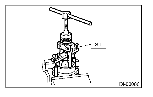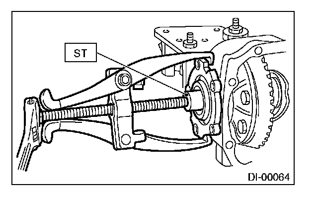 17) Remove the pilot bearing together with the front bearing cone and spacer using the ST.