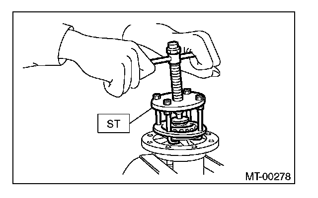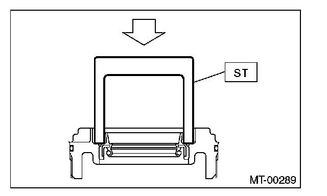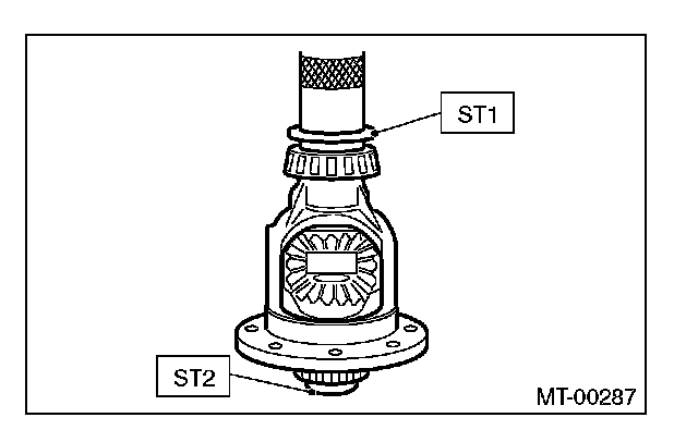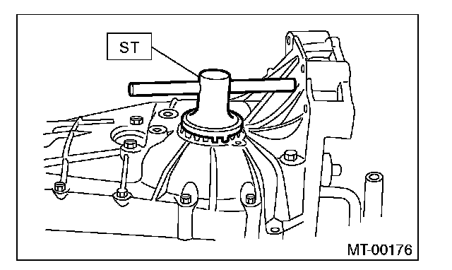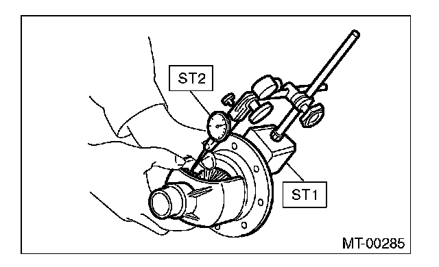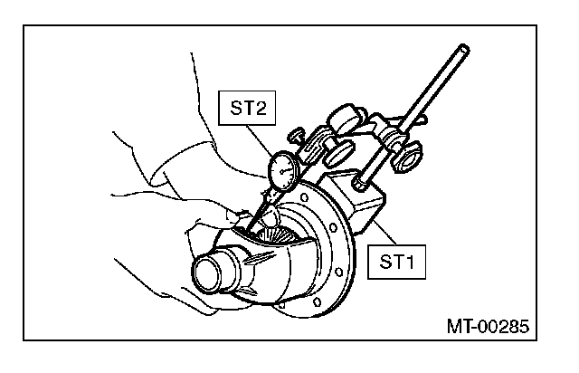 1) Set the ST1, ST2 and ST3. Insert the needle through transmission oil drain plug hole so that the needle comes in contact with the tooth surface on the right corner, and check the backlash.