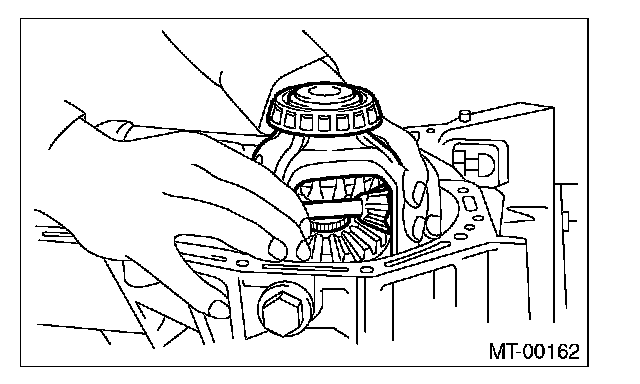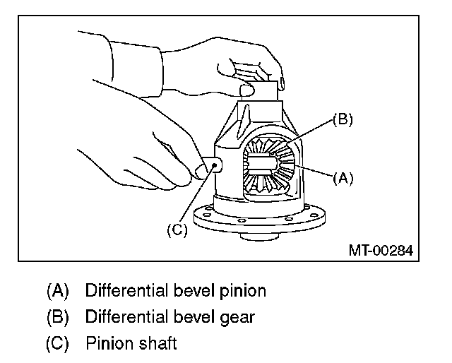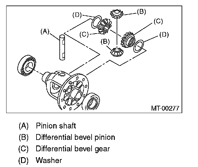 1) Install the differential bevel gear and differential bevel pinion together with washer, and insert the pinion shaft.