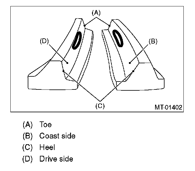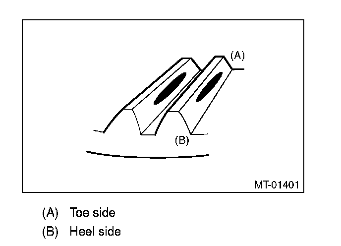 Check item: Tooth contact surface is slightly shifted toward the toe side under a no-load condition. (When driving, it moves towards the heel side.)