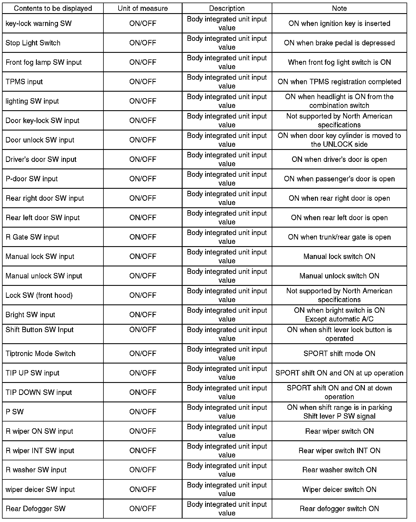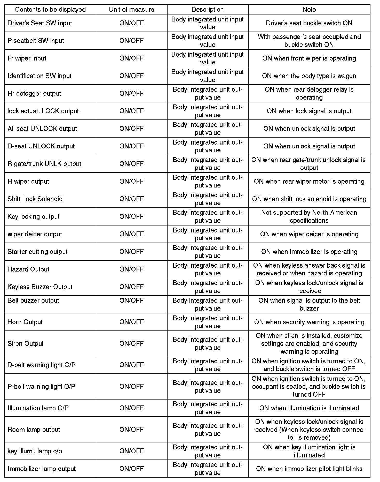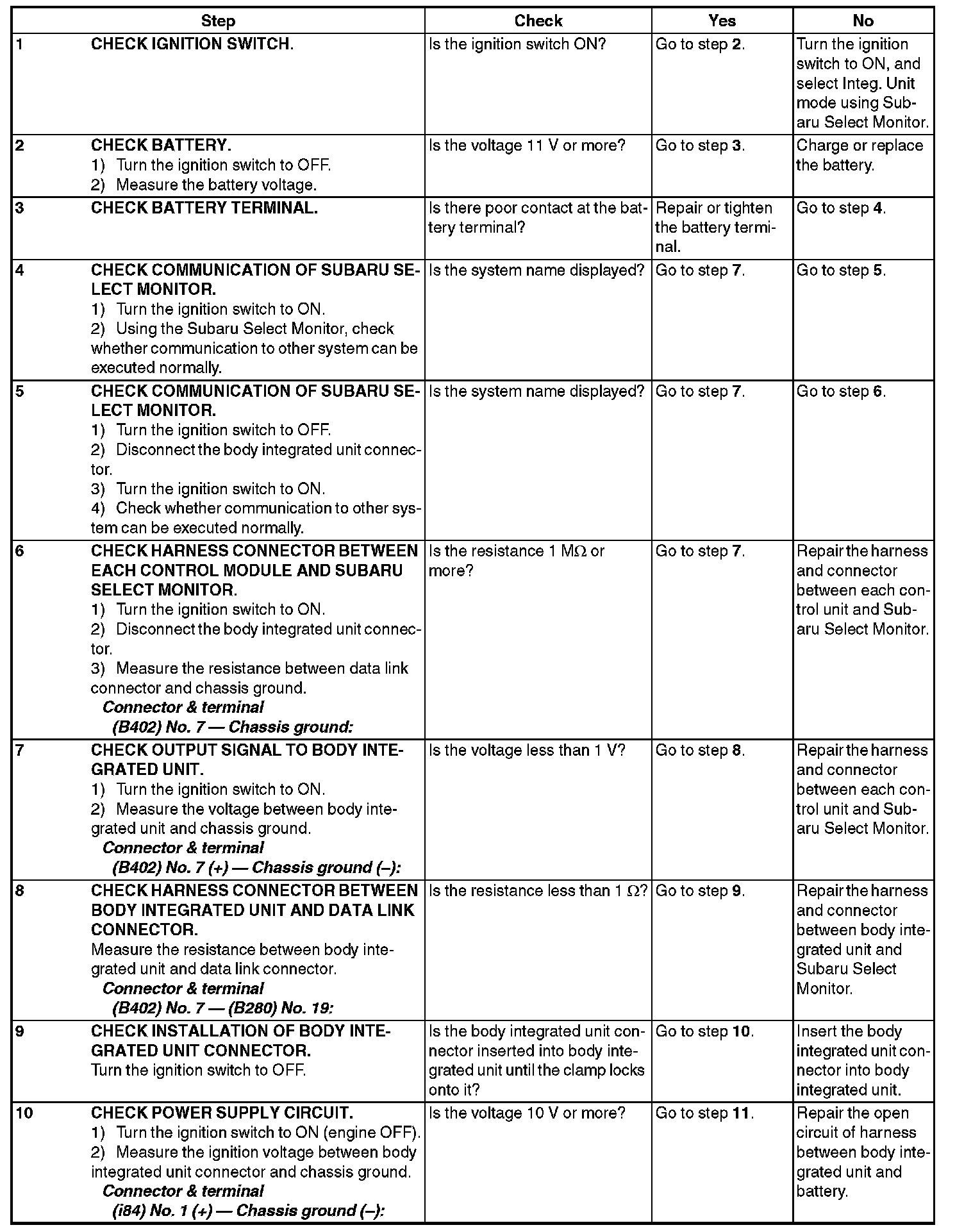 In order to check the body integrated unit function, inspect the body integrated unit and actuator using Subaru Select Monitor without operating switches.