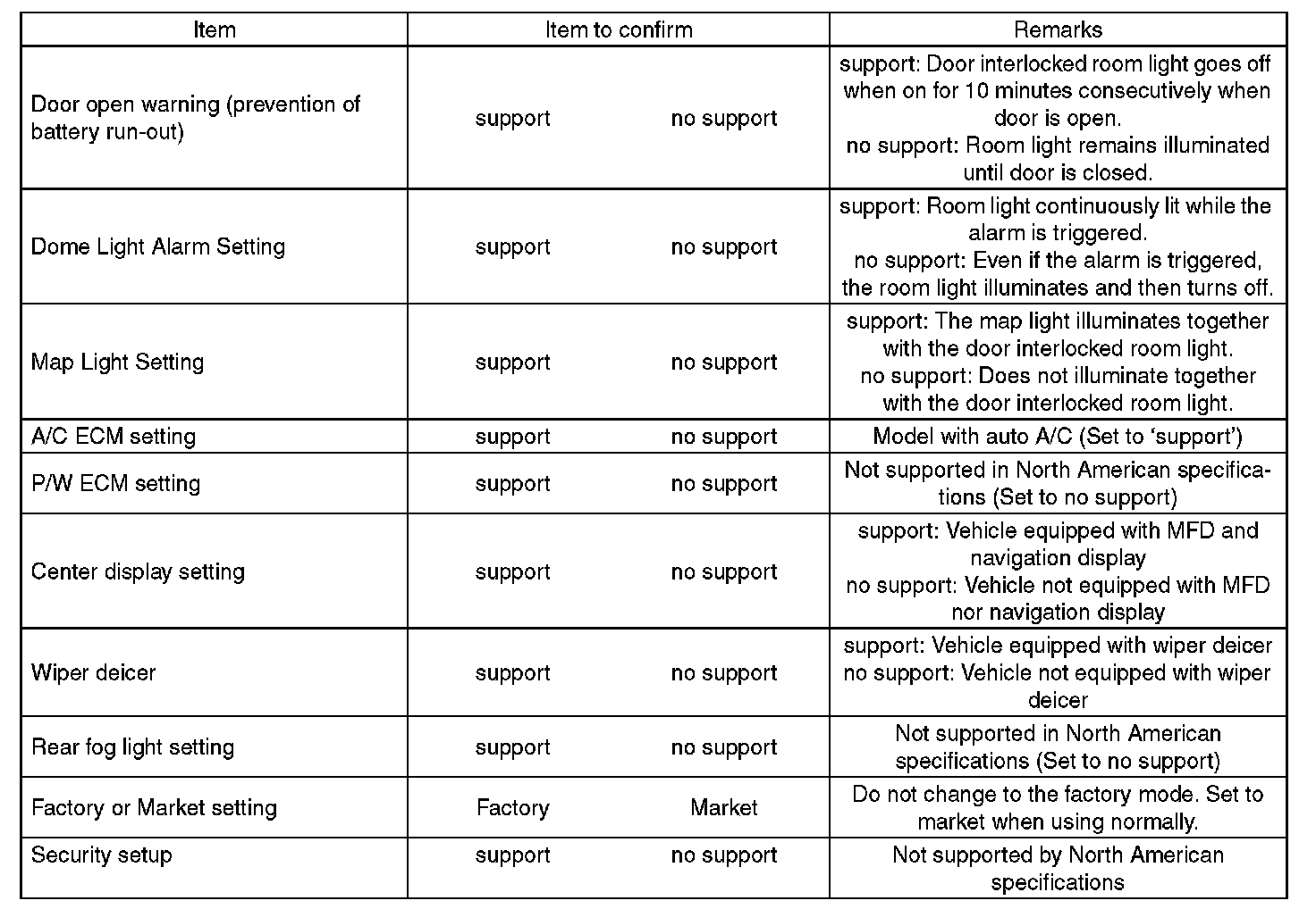- Confirm key illumination does not blink or "Factory or Market setting" of body integrated unit registrations is "Market". If "Factory or Market setting" is set to "Factory", key illumination blinks when ignition key is turned ON to notify that the settings are unconfirmed.
