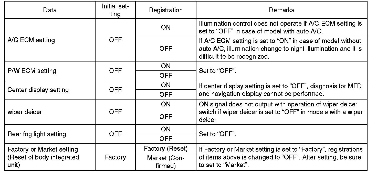 - Be sure not to change Factory or Market setting except installation of new body integrated unit.