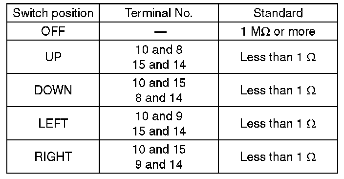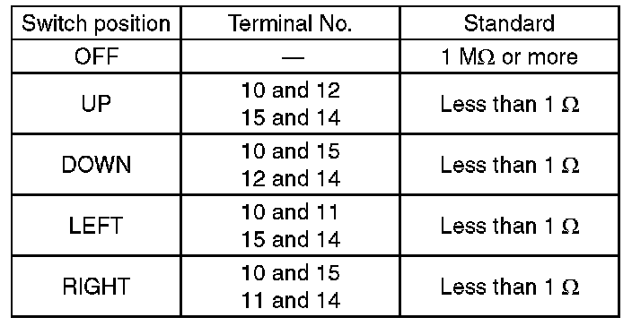 Move the remote control mirror switch to each position and check continuity between terminals.