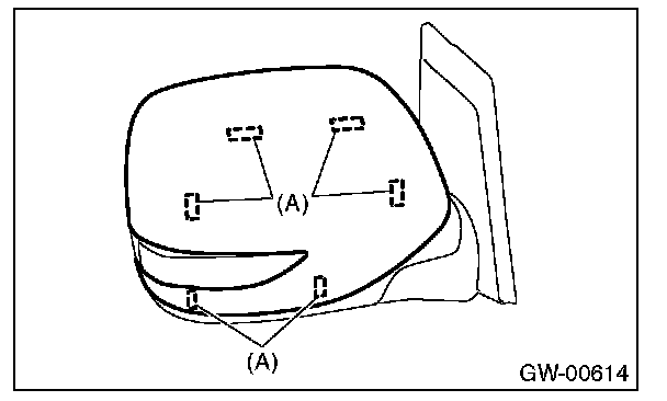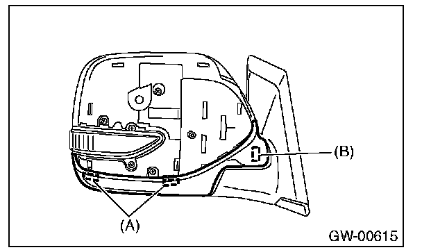 CAUTION: Claw (B) cannot be disengaged from the inside of the outer mirror. When removing, be careful not to damage the parts.