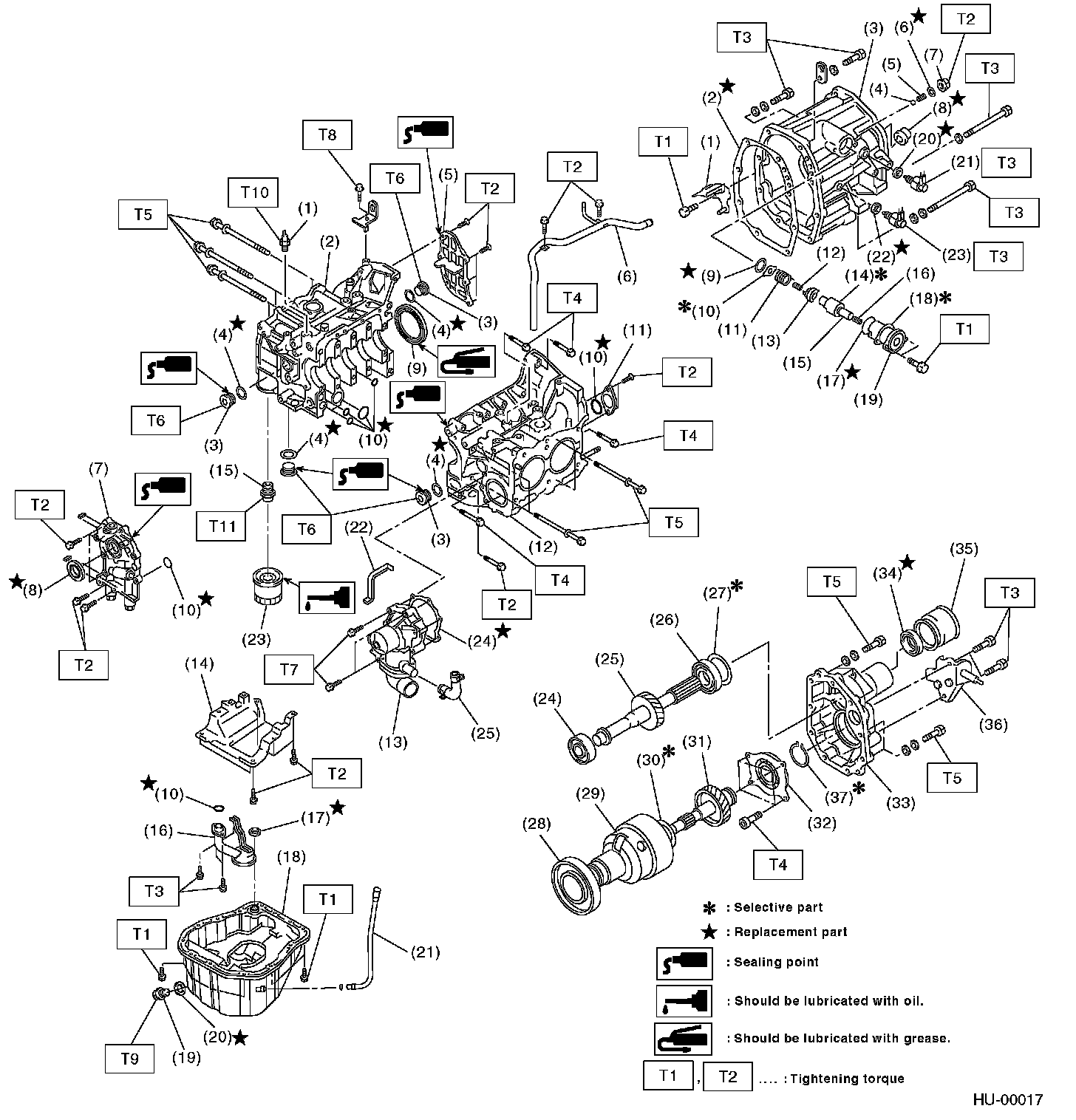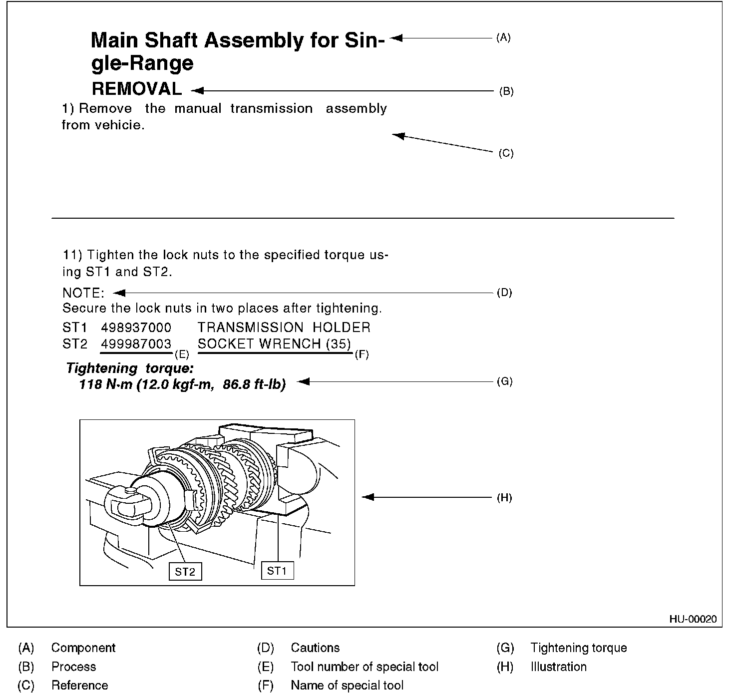 Illustrations are provided for each component. The information necessary for repair work (tightening torque, grease up points, etc.) is described on these illustrations. Information is described using symbol.