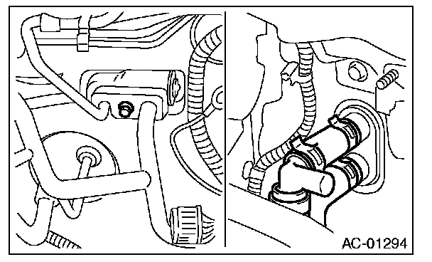 4. Remove the bolts securing expansion valve and pipe in engine compartment. Release the heater hose clamps in engine compartment to remove the hoses.