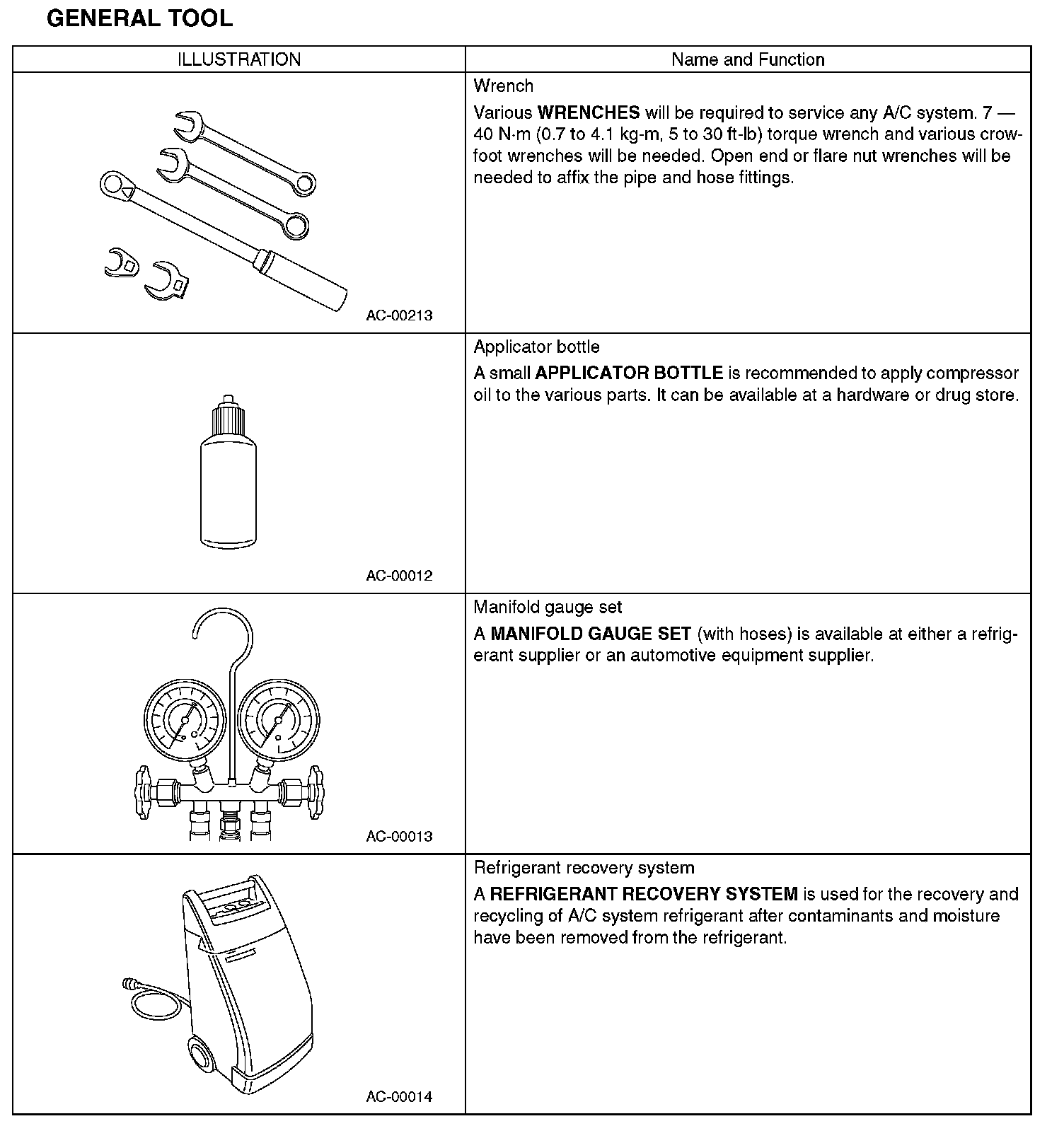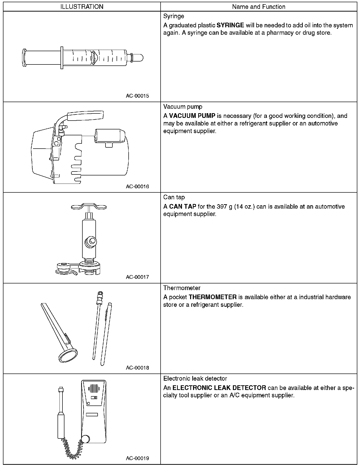 PREPARATION TOOLCAUTION: If HFC-134a and CFC-12 refrigerant or compressor oil is mixed, it will result in poor lubrication and the compressor itself may be damaged, be careful of the following: