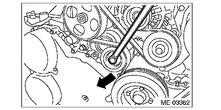 2) Install the tool to belt tension adjuster assembly installation bolt.
