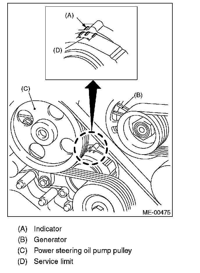 2) Make sure that the V-belt automatic belt tension indicator (A) is within the range (D).
