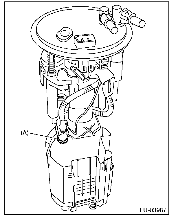 6. Push down the fuel filter assembly in the arrowed direction to remove clip (A), and then disconnect the sub tank bracket assembly and fuel filter assembly.