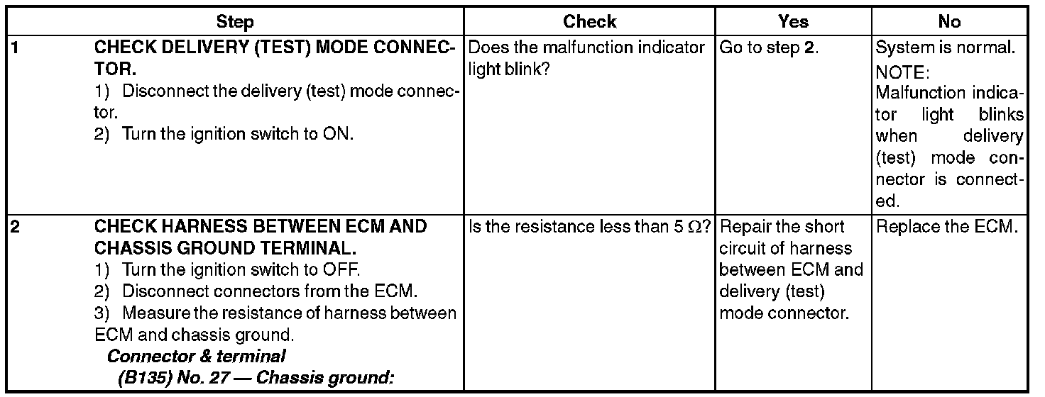 MALFUNCTION INDICATOR LIGHT REMAINS BLINKINGDIAGNOSIS:The delivery (test) mode connector circuit is shorted.