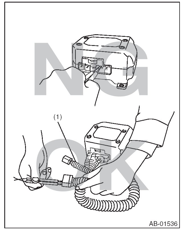 - When checking, use a test harness (1). Damage to connector terminal cause malfunction. Do not directly apply the tester probe to connector terminal of airbag.