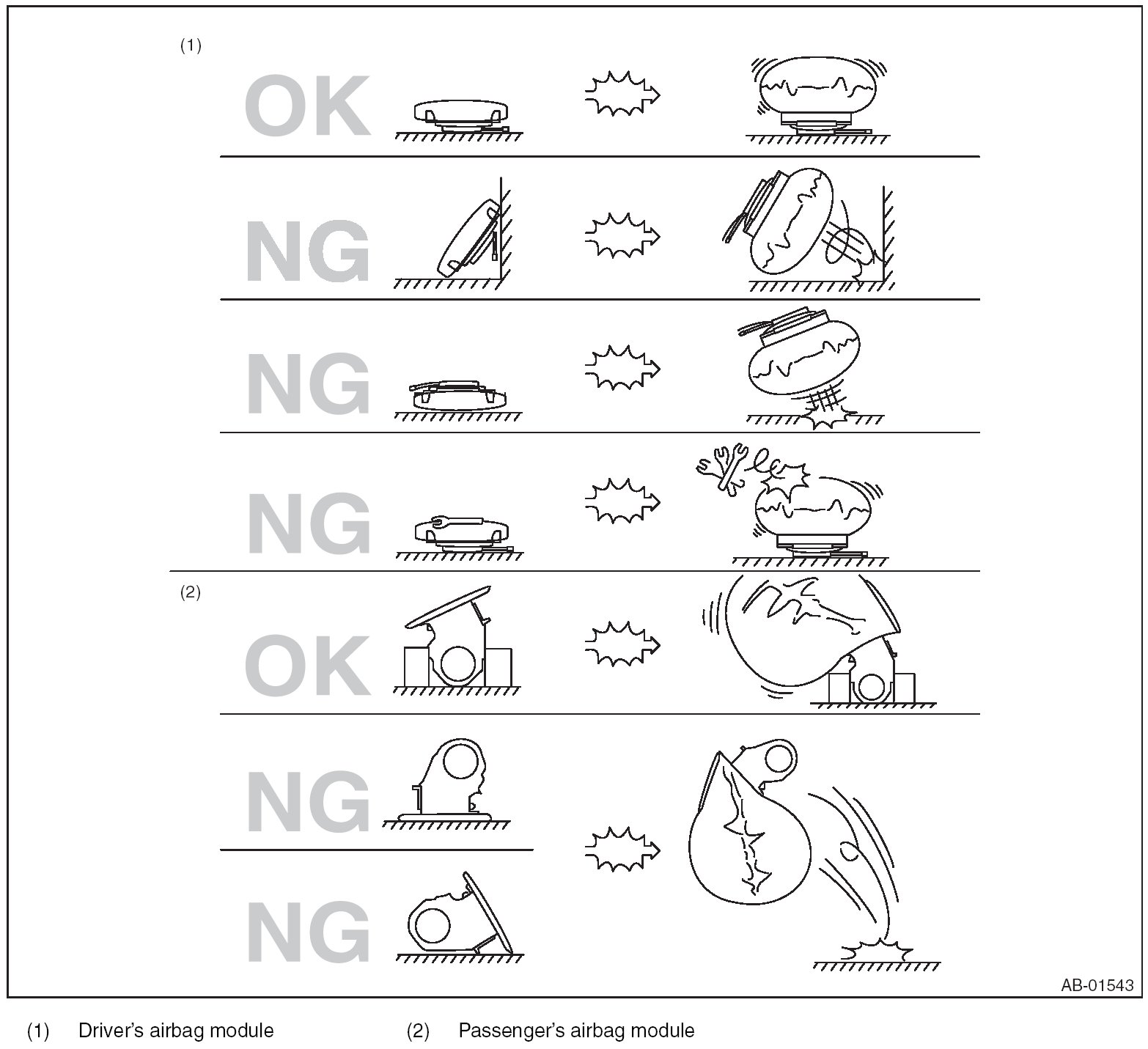 - When storing the removed airbag module, be sure not to place it with its pad side facing downward. Do not place any objects on the airbag module. Do not stack them on top of each other. If the airbag module pad contacts with any other object, it could cause a serious accident if the airbag inflates for some reason.