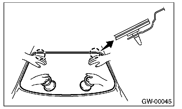 1. Align the molding (A) to both the upper edge ends of windshield glass (C).