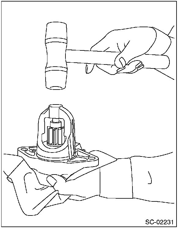 9. Lightly tap the starter housing assembly with a plastic hammer as shown in the figure, and remove the overrunning clutch, internal gear assembly, shaft and shift lever together as one piece.