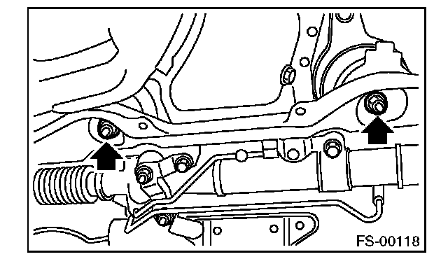 11) Support the crossmember with a jack, remove the bolts securing crossmember to body, and then gradually lower the crossmember with steering gearbox as a unit.