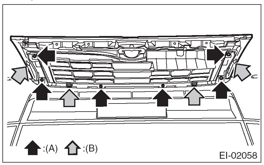 3. Detach the tabs (B) and remove the front grille assembly.