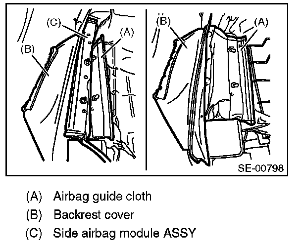 - When installing the side airbag module assembly, be sure to install it by inserting the side airbag module between the backrest cover and airbag guide cloth.