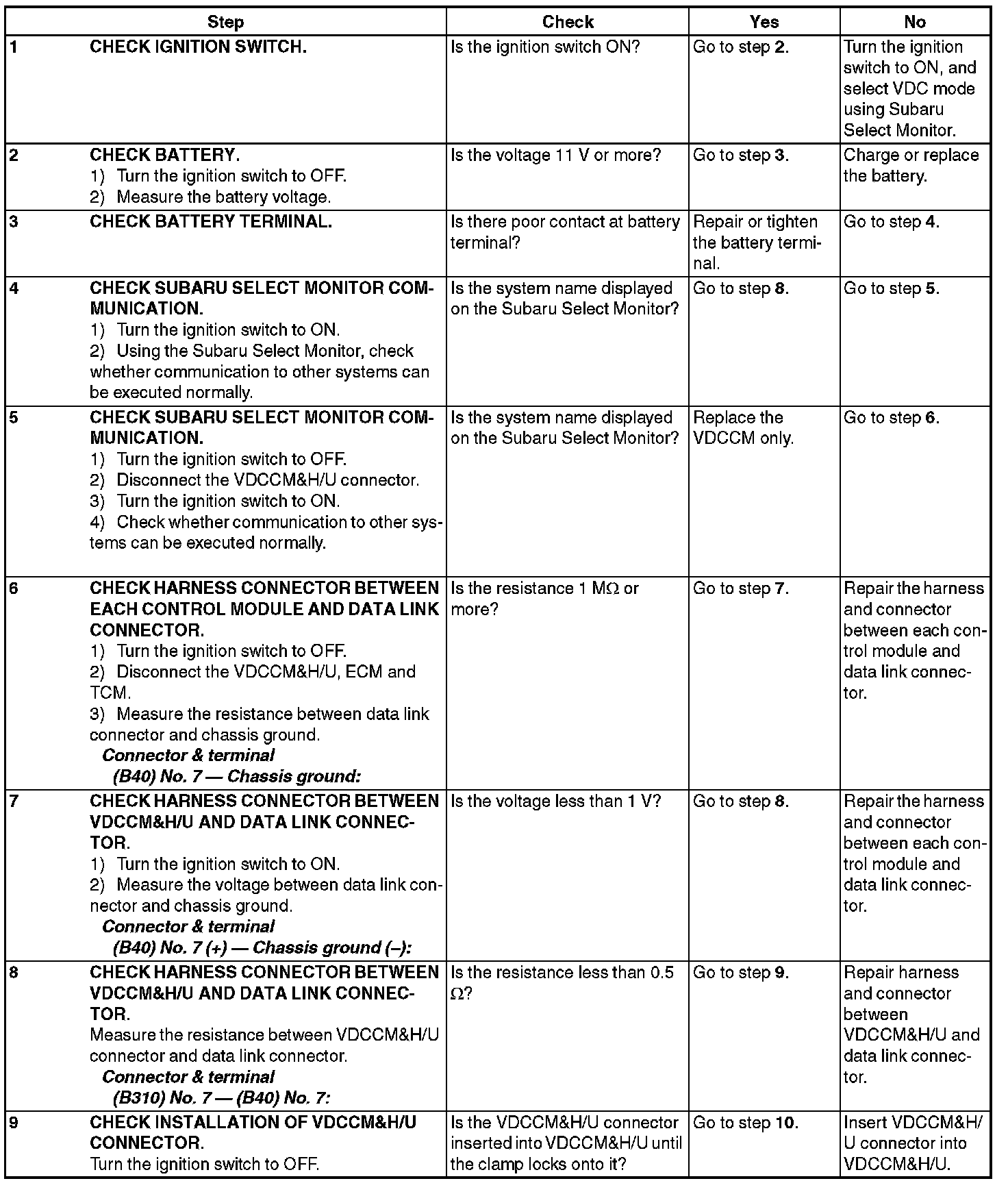 9) If VDC and Subaru Select Monitor cannot communicate, check the communication circuit.