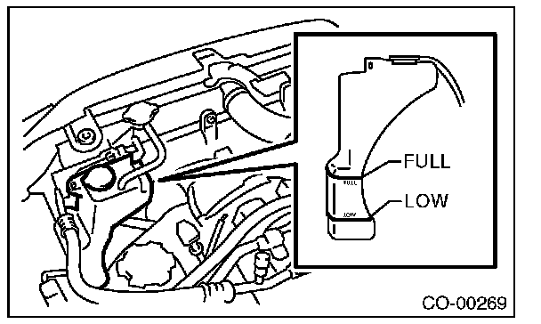 3) Fill engine coolant into the reservoir tank up to "FULL" level.