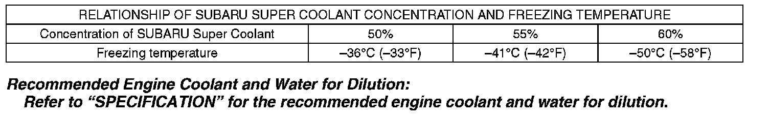 SUBARU Super Coolant concentration must be used from 50 to 60 % to assure the best performance of the anti-freeze and anti-rust agents.