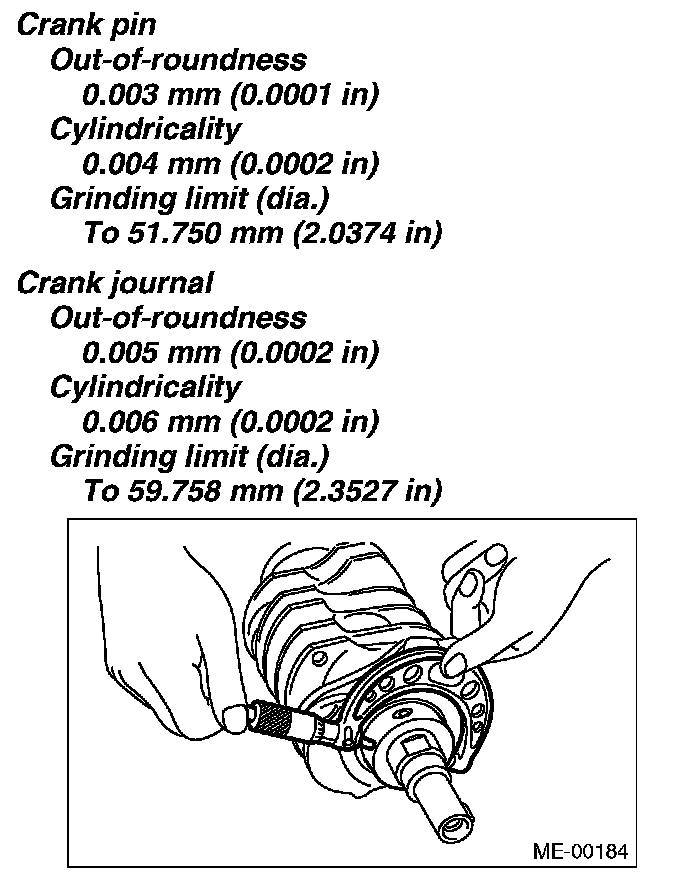 3) Inspect the crank journal and crank pin for wear. If they are not within the standard, replace the bearing with a suitable (undersize) one, and replace or grind to correct the crankshaft as necessary. When grinding the crank journal or crank pin, finish them to the specified dimensions according to the undersize bearing to be used.