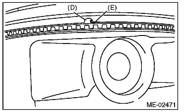 25) Rotate the crankshaft to bring #1 and #2 pistons to bottom dead center position, then remove the piston snap ring through service hole of #1 and #2 cylinders.
