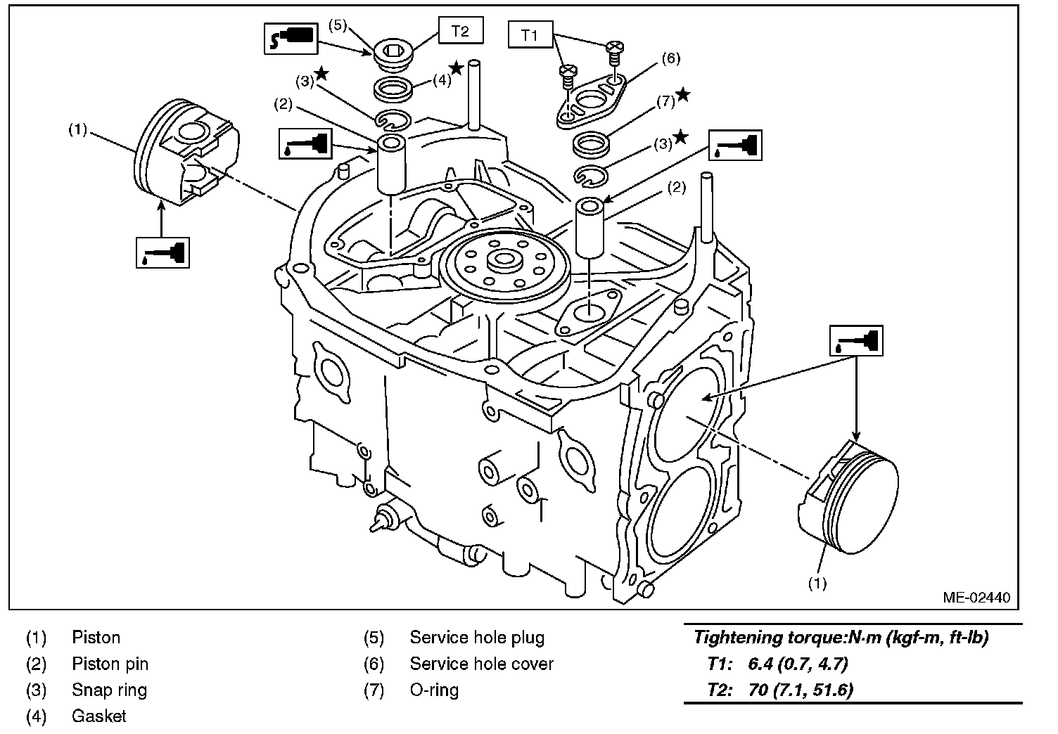 3) Apply a coat of engine oil to piston pin, and insert the piston pin into piston and connecting rod through service hole.