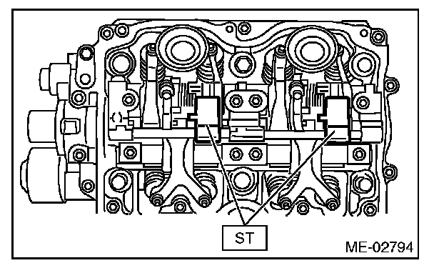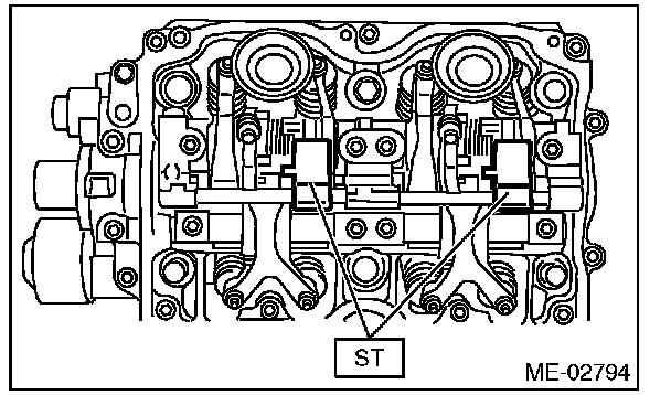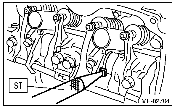 ^ Set the ST in the position shown in the drawing to mount the intake valve rocker assembly.
