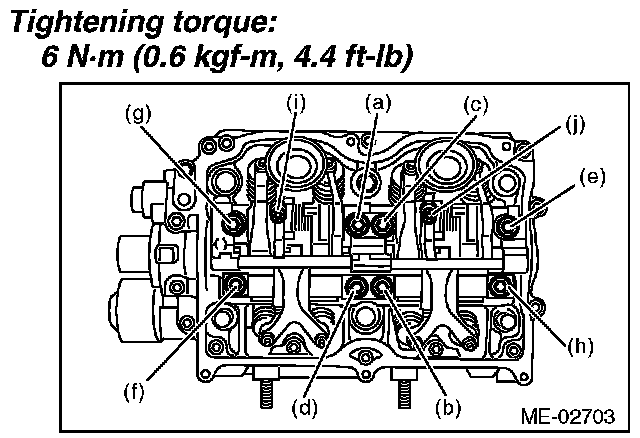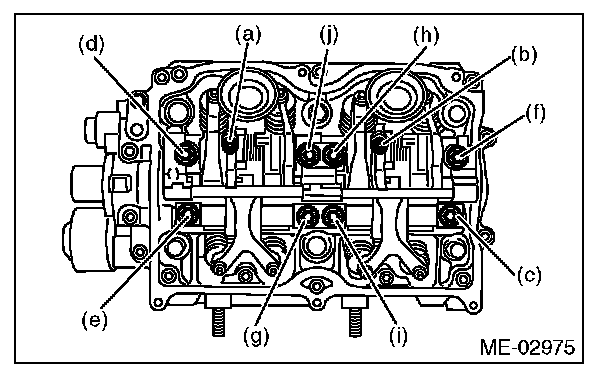 Leave two or three threads of bolts (i) and (j) engaged in order to retain the valve rocker assembly.