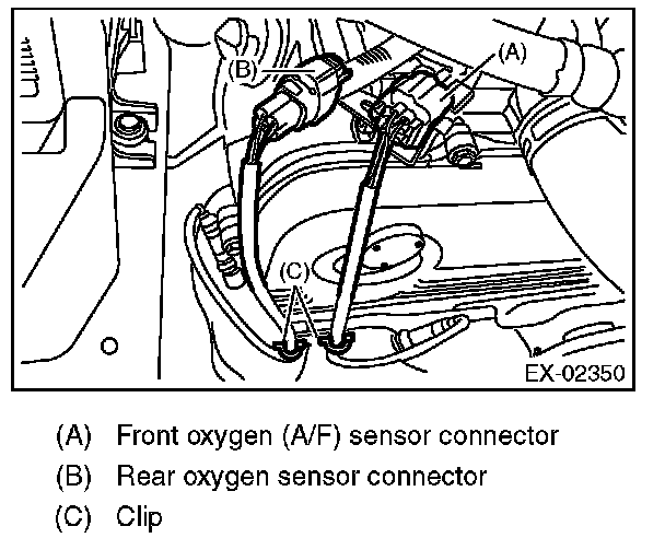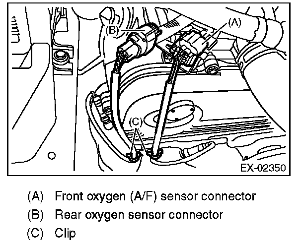 4. Remove the clip fastening the harness and disconnect the rear oxygen sensor connector.