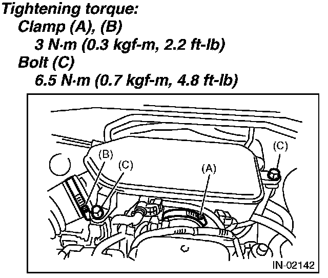 2. Loosen the clamp (B) which connects intake boot to air intake chamber.