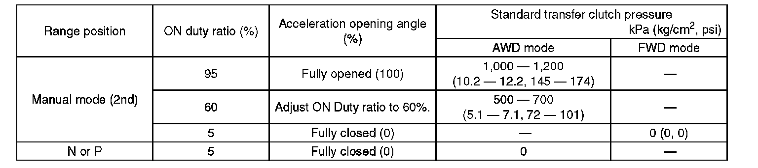 Check the transfer clutch pressure in accordance with the following chart in the same manner as for line pressure.