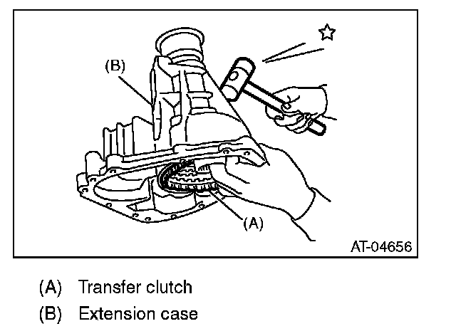 1) Hit the extension case lightly with a plastic hammer, and take out the transfer clutch.