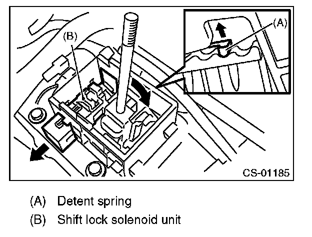 10) With detent spring lifted up, push the select lever backward and remove the shift lock solenoid unit.