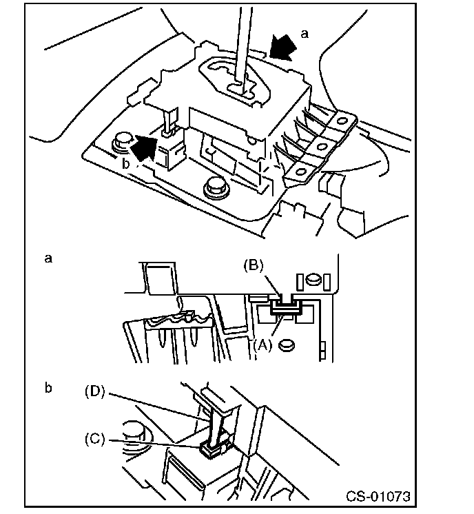 ^ Insert link (D) of the shift lock release into link (C) of the shift lock solenoid unit.
