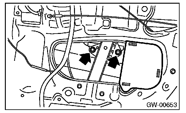4. Operate the power window switch to move the glass, and remove the two bolts.