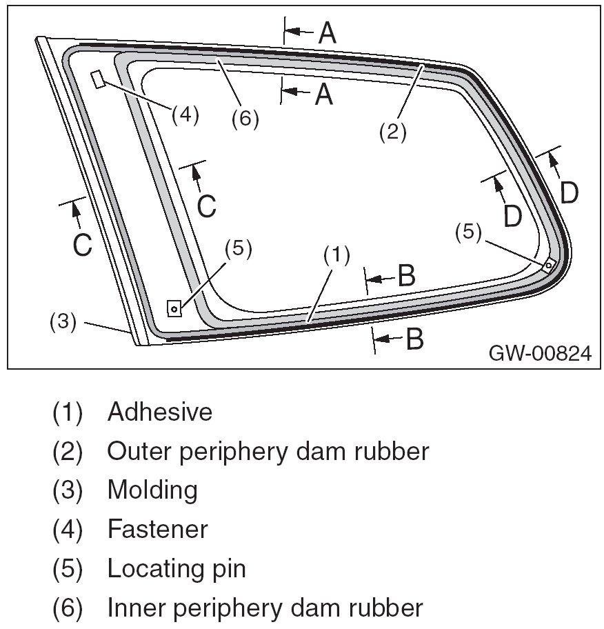 7. Apply adhesive in the same procedure as for the windshield glass.