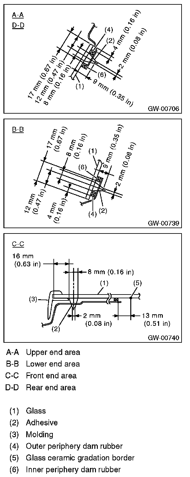 5. On the front end, attach the inner periphery dam rubber at a position 13 mm (0.51 in) from the border of the glass ceramic gradation, and for other locations 17 mm (0.61 in) from the end of the glass.