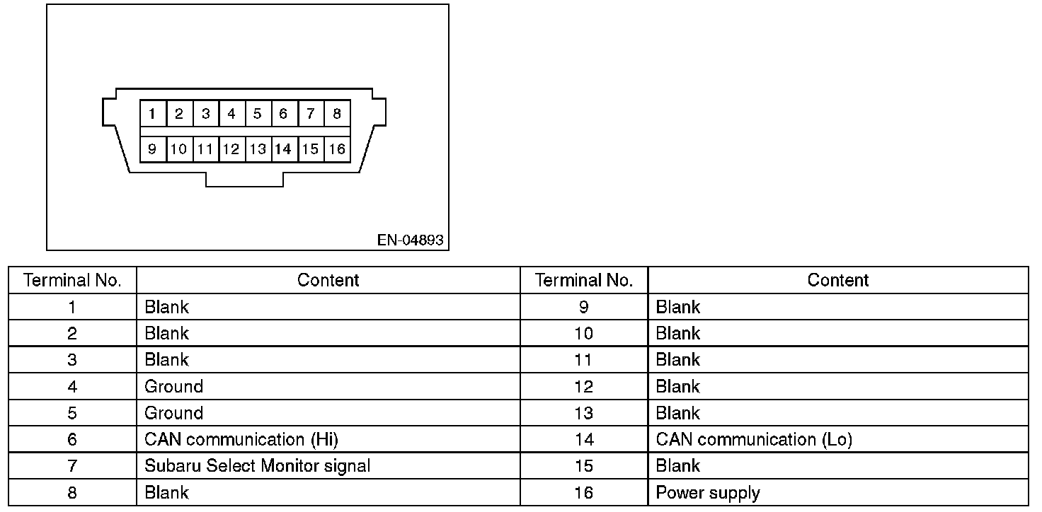 CAUTION: Do not connect any scan tools other than Subaru Select Monitor or general scan tool because the circuit for Subaru Select Monitor may be damaged.