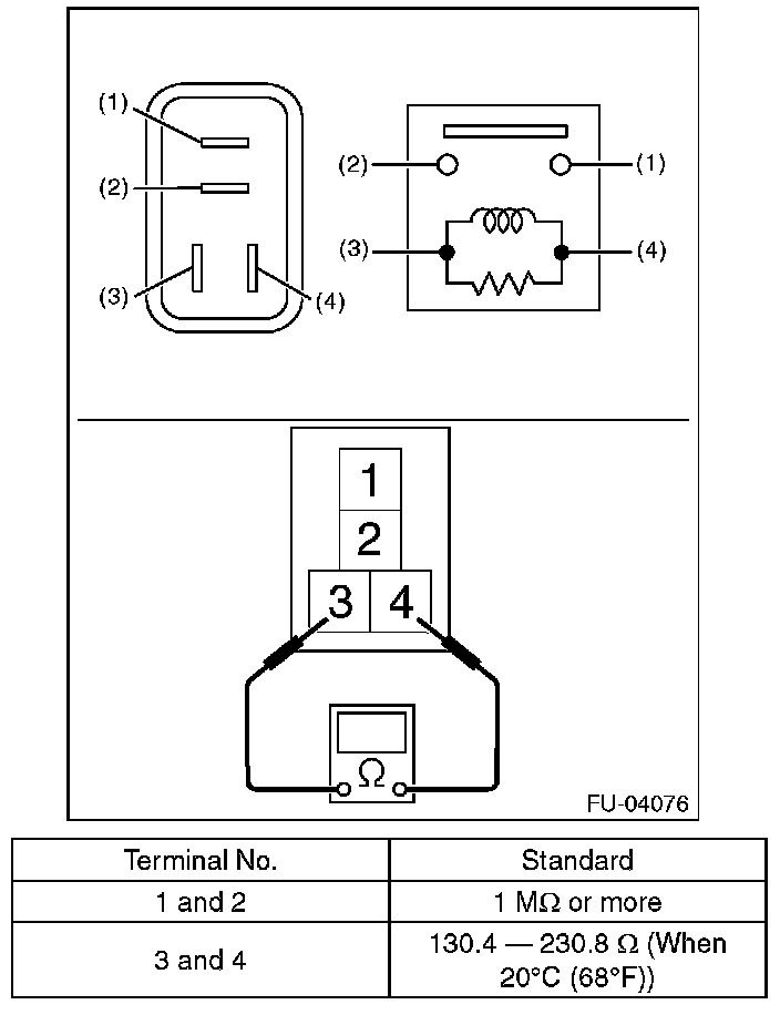 2. Connect terminal No. 3 to the battery positive terminal and the No. 4 terminal to the battery ground terminal, and measure the resistance between the main relay terminals.
