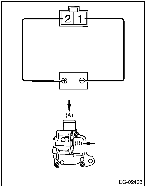 3. Connect the terminal No. 2 to the battery positive terminal and the terminal No. 1 to the battery negative terminal. When supplying air to (A), check that air is discharged from (B).