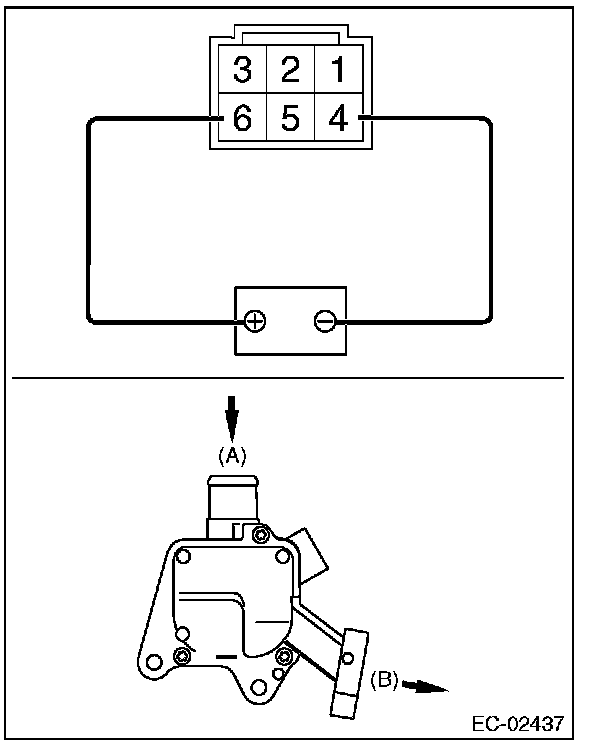 3. Connect the terminal No. 6 to the battery positive terminal and the terminal No. 4 to the battery negative terminal. When supplying air to (A), check that air is discharged from (B).